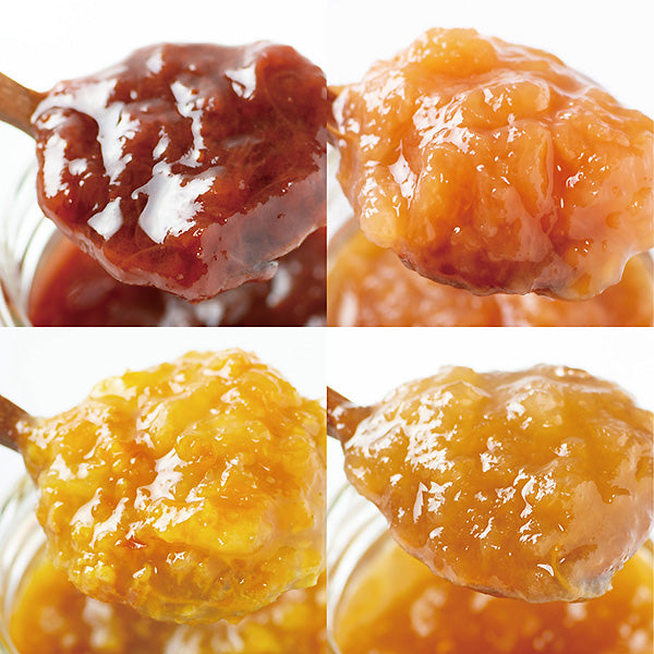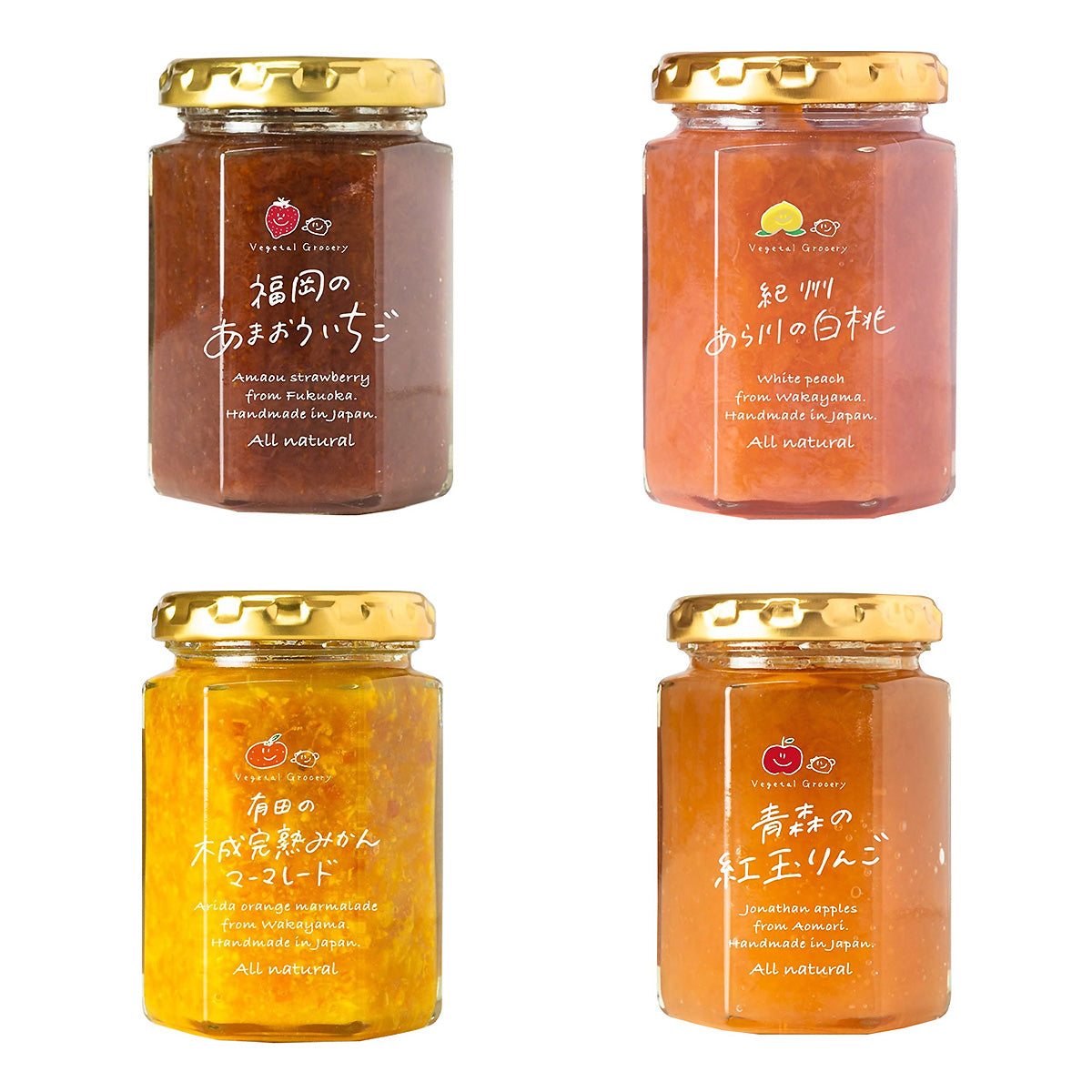 人気のあまおういちご、あら川の白桃、紅玉りんご、有田みかんマーマレードの4種類を詰合せにてお届けします。